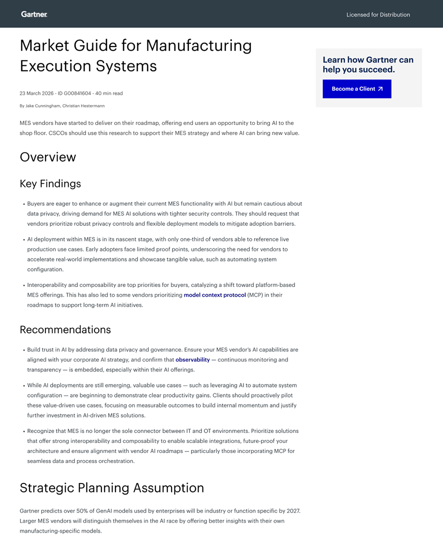 In the report, Gartner® provides a comprehensive view of the MES landscape, helping manufacturers understand how the market is evolving, how vendors are positioned, and what capabilities are becoming critical for success.
