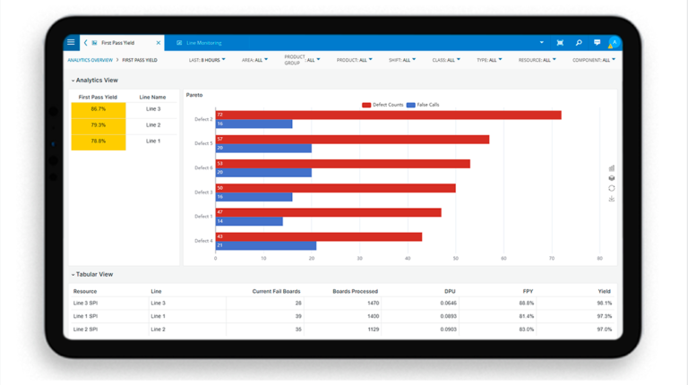 Dieses intuitive Dashboard mit globaler Übersicht ermöglicht es, zentrale KPIs wie Fehlerraten und Ausbeute maschinenübergreifend zu überwachen – und liefert in Echtzeit Einblick in den Produktionszustand. So können Ineffizienzen gezielt behoben, Ausfallzeiten reduziert und die Leistungsfähigkeit der SMT-Linien optimal ausgeschöpft werden. Die gewonnenen Erkenntnisse bilden die Grundlage für nachhaltige Verbesserungen in Qualität und Prozessstabilität.