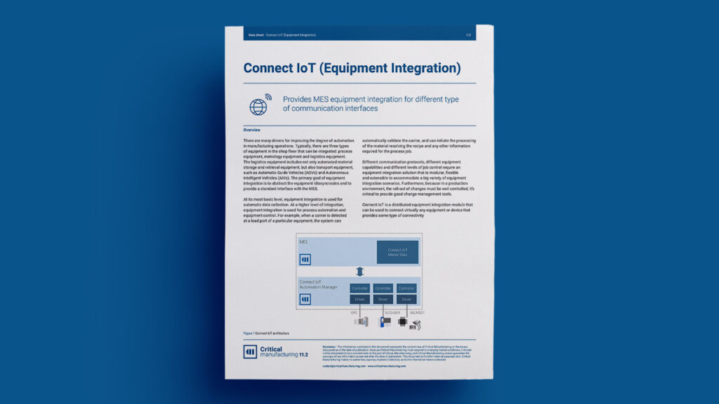 Connect IoT module provides MES equipment integration for different type of communication interfaces. It is a distributed equipment integration module that can be used to connect virtually any equipment or device that provides some type of connectivity.