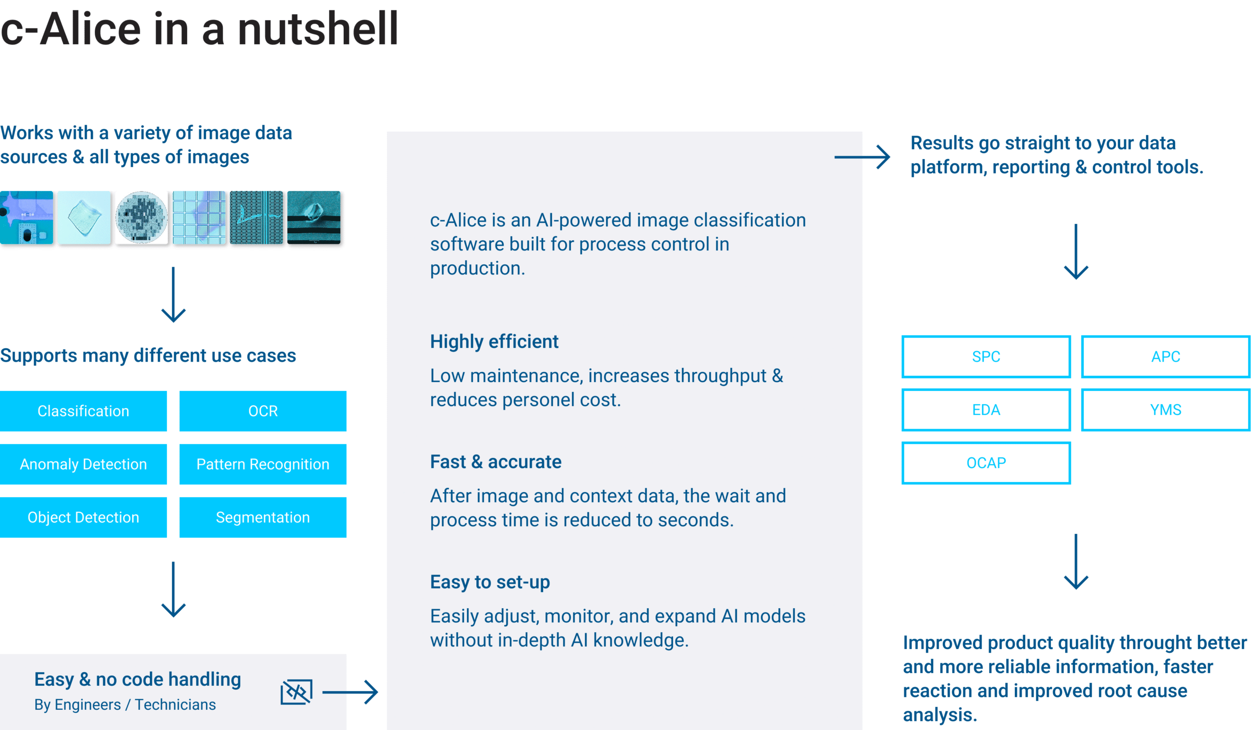 Download Data sheetc-Alice is an AI-powered image classification app, built for complex production environments that depend on high-volume image data from multiple systems for quality control.