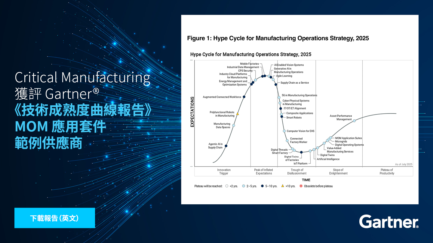 Critical Manufacturing 榮獲 Gartner®《技術成熟度曲線報告》中的 MOM 應用套件範例供應商認可