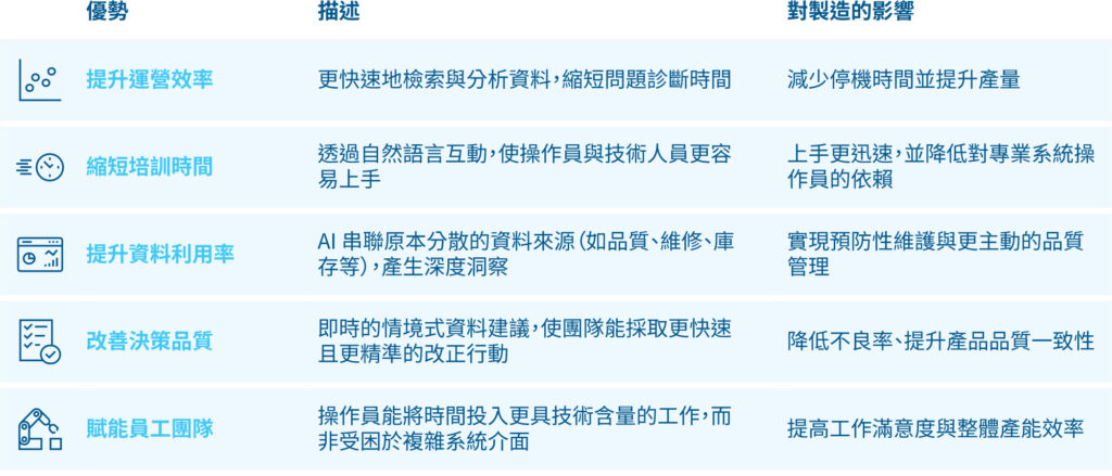 它本質上允許人員——從車間操作員到工廠經理——「與 MES 對話」,減輕認知負擔,加快資訊取得與決策速度。
