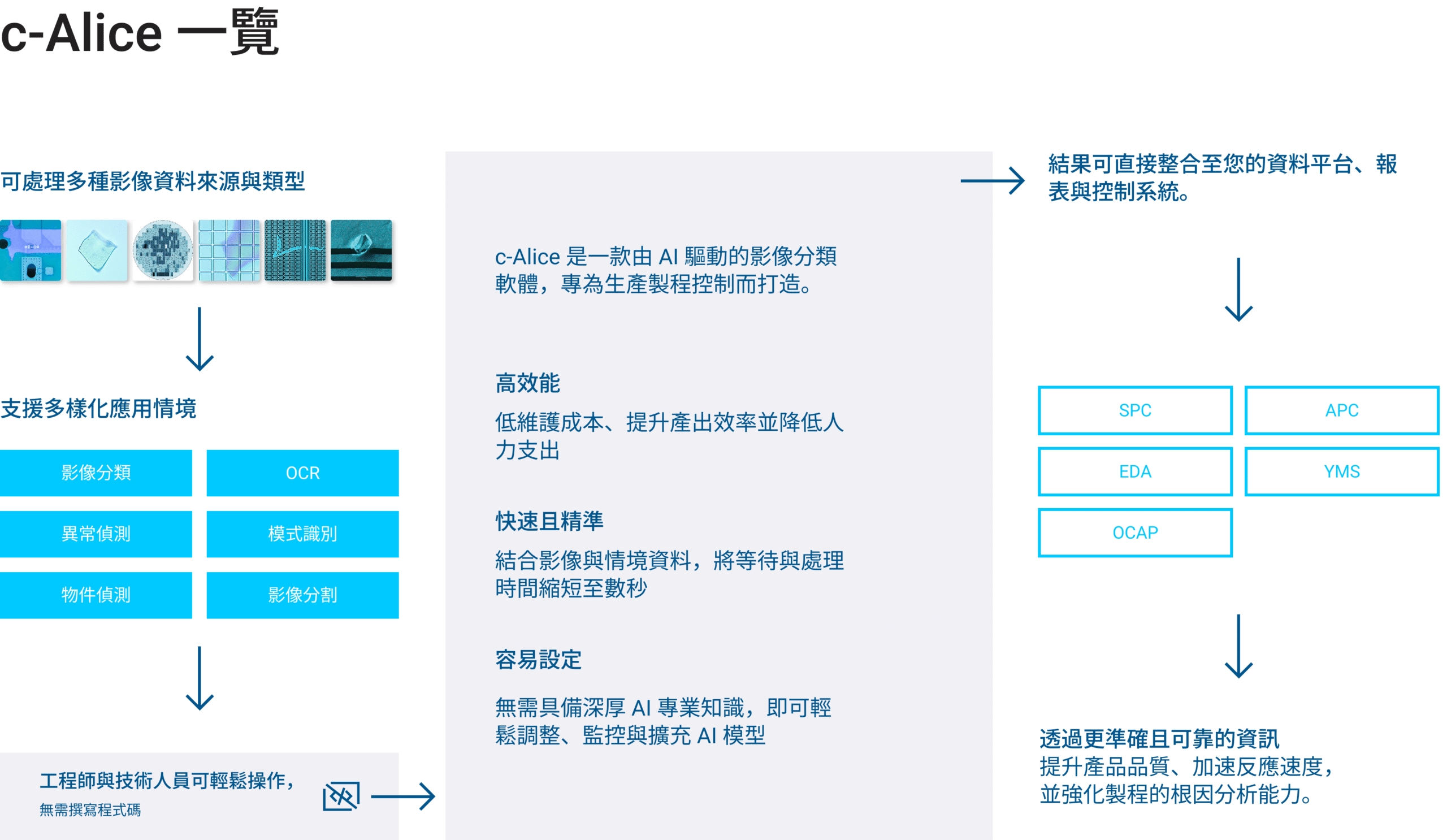 c-Alice 是一款以 AI 驅動的影像分類應用程式,專為依賴多系統高量影像數據進行品質管控的複雜生產環境而設計。
